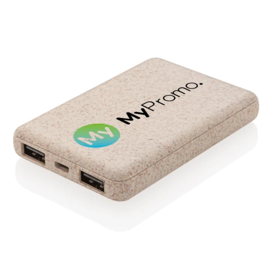 Vous cherchez une batterie de secours durable et efficace? Notre nouvelle batterie externe en fibre de blé naturelle de 5000 mAh est idéale pour les déplacements professionnels ou personnels. Le matériau durable en fibre de blé (35%) vous permet de recharger votre téléphone jusqu'à trois fois avec une seule charge, tandis que l'indicateur de puissance pratique vous indique la quantité d'énergie disponible. Grâce à une entrée de 5V/2A et deux sorties USB (5V/2A et 5V/1A), vous pouvez facilement recharger deux appareils en même temps. Offrez ce produit à vos employés ou clients et montrez-leur que vous vous souciez de l'environnement tout en leur offrant un produit pratique.
