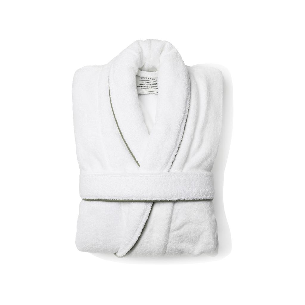 Peignoir luxueux 100% coton. Le peignoir est un modèle classique avec un col extra large et une ceinture à la taille. Il présente également plusieurs détails sympathiques, tels que des coutures fermées et un passepoil contrastant sur le col. Fabriqué à partir d'une longue fibre de coton avec des fils non tordus. Le résultat est un peignoir incroyablement doux que vous ne voudrez jamais enlever.