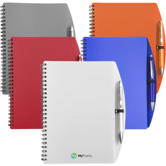 Carnet à spirale en PP souple de format A5 contenant 70 feuilles lignées de 70g, livré avec un stylo bille en plastique, mine bleue.