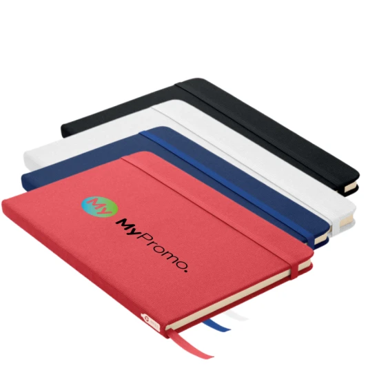 Carnet A5 avec couverture rigide en RPET 600D. Reliure. 160 pages lignées en papier recyclé (80 feuilles). Bande élastique de fermeture et ruban marque-page assortis.