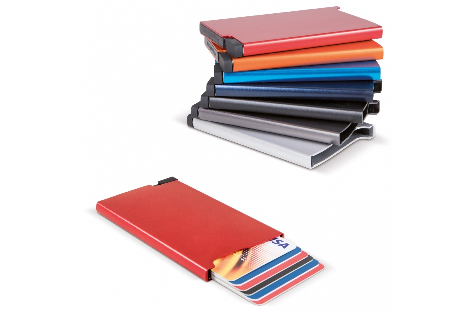 Porte-cartes BusinessTop Design en aluminium pour protéger vos cartes contre l'écrémage RFID. Il suffit d'appuyer sur le bouton et insérer jusqu'à 6 cartes (4 en relief).