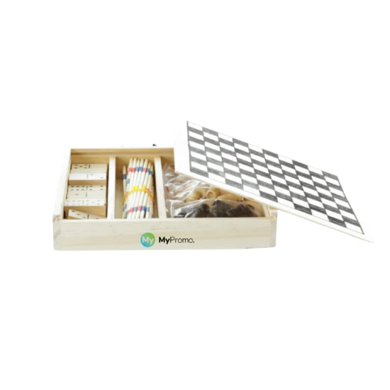 Set de quatre jeux en bois comprenant le mikado, les échecs, les dames et les dominos. Présenté dans une caisse en bois avec couvercle et côté lisse pour le marquage.
