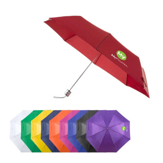 Parapluie pliable de 8 panneaux de polyester 170T dans une large gamme de couleurs vives et de 96cm de diamètre. Ouverture manuelle, avec des tiges en métal de couleur argentée, fermeture velcro et sangle de transport dans la poignée ergonomique. Présenté en couverture individuelle correspondante.