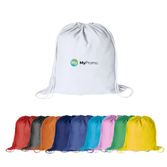 Sac à dos à cordelettes en tissu 100% coton doux et proposé dans des couleurs vives. Cordelettes de serrage assorties.