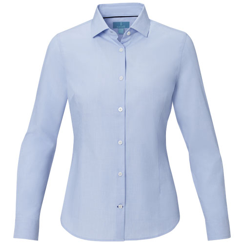Vêtements promotionnels durables. Col semi-étendu. Boutons en perle gravés. Poignet ajustable avec pli simple. Passepoil satiné à l'intérieur du col. Coutures de couleur contrastée sur la patte de manche et la patte de boutonnage inférieure. Étiquette tissée. Popeline 100% Coton bio certifié GOTS, 121 g/m2.